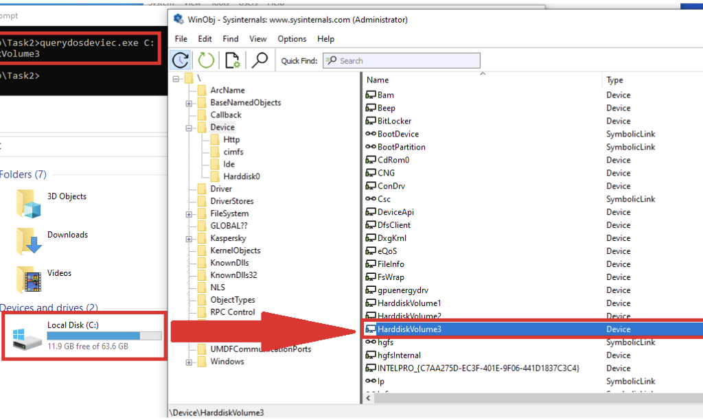 For example, the drive letter C: is typically mapped to a device object like \Device\HarddiskVolume3. This mapping is maintained by the Object Manager and allows legacy MS-DOS-style path referencing to work with the underlying NT object namespace. An illustration of such a mapping can be seen in the figure below.