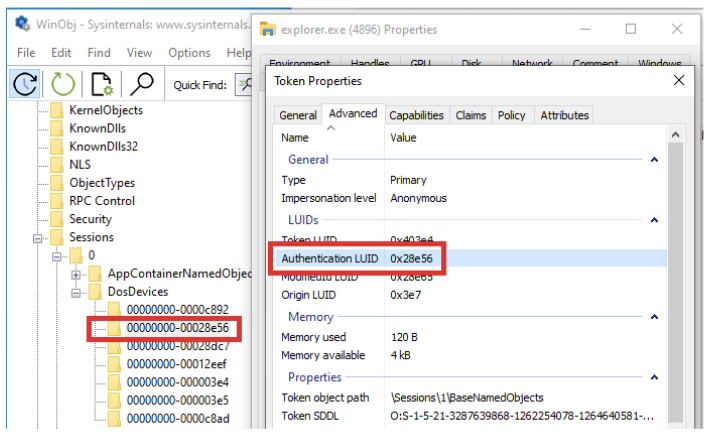 The path prefix \??\ in Windows has a very special meaning. In reality, \??\ represents the local DOS device directory of the current user. This means that the same path, such as \??\E:, may resolve to different locations in the Object Manager depending on the user context. Specifically, \??\ is actually a symbolic link that points to the real path \Sessions\0\DosDevices\00000000-XXXXXXXX, where XXXXXXXX is the Authentication ID of the currently logged-in user. As shown in the figure below, an example ID is 00028e56.