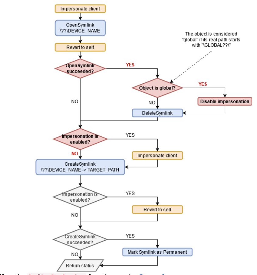 If the symbolic link is not global and already exists, CSRSS deletes it. Then, depending on whether the creation requires user-level permissions, CSRSS either re-enables impersonation or proceeds under its own context.