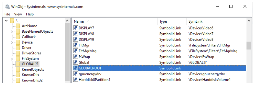 PHASE 2. The same input path, \??\GLOBALROOT\KnownDlls\FOO.dll, is used again. But now, in SYSTEM context, \??\ maps to \GLOBAL??\. This transforms the path into \GLOBAL??\GLOBALROOT\KnownDlls\FOO.dll. The function looks for GLOBALROOT under \GLOBAL??\, and finds an existing symbolic link that points to the root object directory \, which is the root directory of all kernel objects (as illustrated in the figure below). The final resolved path becomes \KnownDlls\FOO.dll.