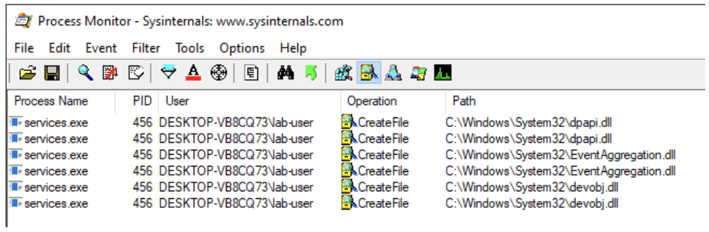 Finally, we use Process Monitor to observe which DLLs services.exe loads. By applying a few filters in Process Monitor, we identify DLLs that are loaded by services.exe. The result is that services.exe loads three DLLs that are not listed in \KnownDlls (as shown in the figure below). However, this information alone is not enough to determine which DLL to hijack. The selection depends on the operating system version and several other factors.
