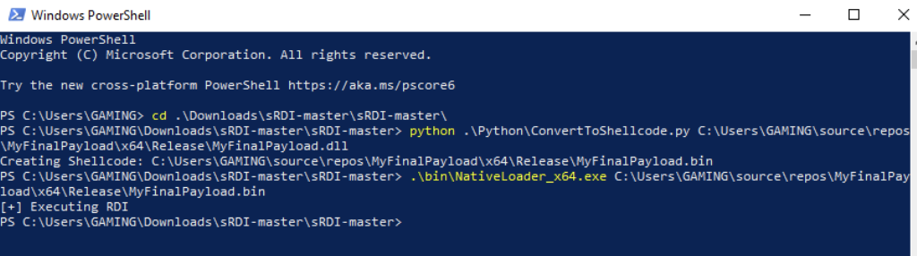 When executed, the stub automatically redirects to ReflectiveLoader, which performs the rest of the loading process. The injector treats this shellcode like any standard position-independent payload. We utilize an existing tool, available at https://github.com/monoxgas/sRDI/, to convert our DLL into a position-independent shellcode suitable for sRDI injection.