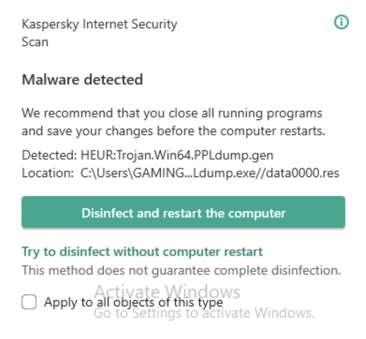 Instead of simply blocking the action, Kaspersky initiated a response protocol: first, it terminated the compromised process to prevent further damage; then, it immediately restarted a clean instance of itself to maintain uninterrupted protection. This behavior is evident in the figure below.