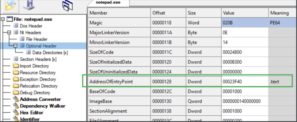 - Get a pointer to the AddressOfEntryPoint address within the target process optional header