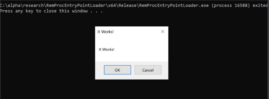 Using the sample code provided, our shellcode is successfully injected and executed in the remote process: