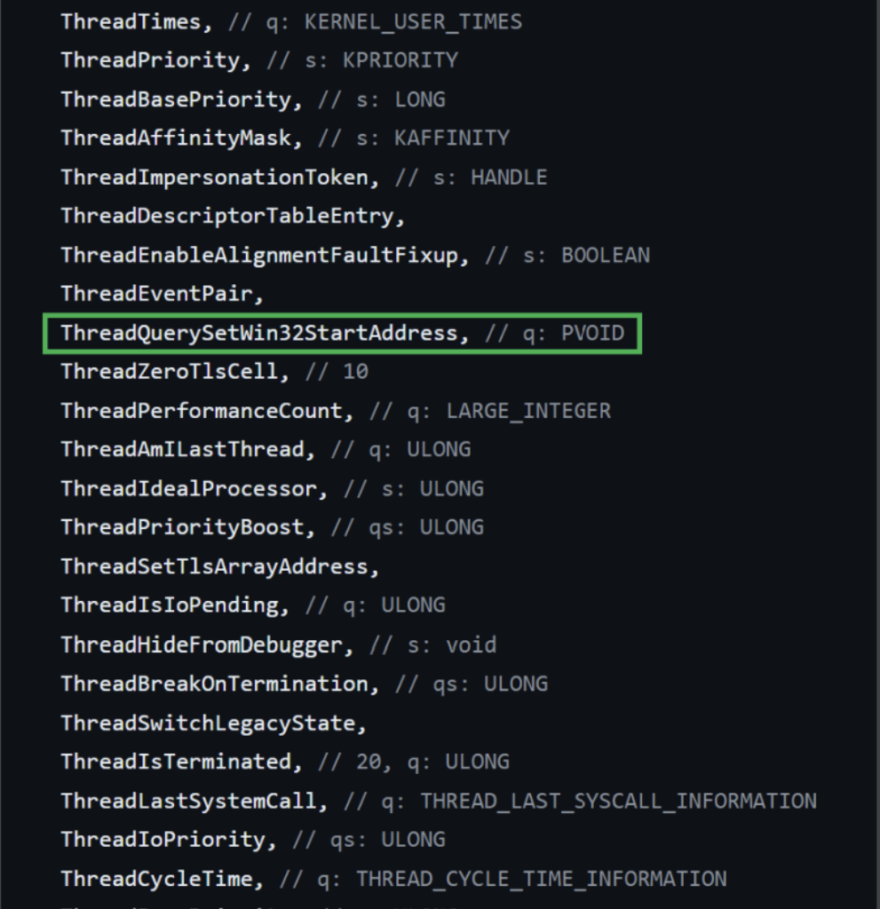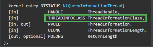 Although very interesting, information about the THREADINFOCLASS enum was not readily accessible on the Microsoft site. However, a quick Google search leads us to the ProcessHacker GitHub repo page containing a definition for the enum: