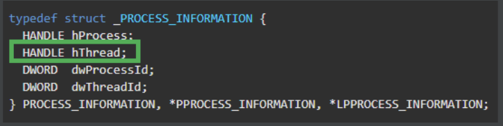 First, we must figure out how to actually obtain a handle to the primary process thread. Fortunately, this is quite trivial since we start the process with CreateProcess(). The information is readily available as a pointer to the PROCESS_INFORMATION structure. Conveniently, Microsoft states: