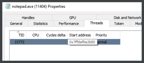 Analyzing the suspended process in ProcessHacker, we see a single thread pointing to a start address of 0x7ffdaf6a2680.