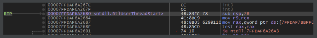 Once we attach the x64dbg debugger to the suspended program, the program state resumes but the single thread remains suspended. The instruction pointer currently points to the start address of the single thread for execution of the ntdll:RtlUserThreadStart() function.