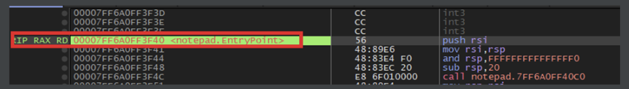 Moving forward, we manually resume the suspended thread to continue through the remainder of the process initialization, and then add a breakpoint in the debugger for the ThreadQuerySetWin32StartAddress returned memory address (0x7ff6a0ff3f40). When we run the application, the breakpoint hits on the resolved program entry point address: