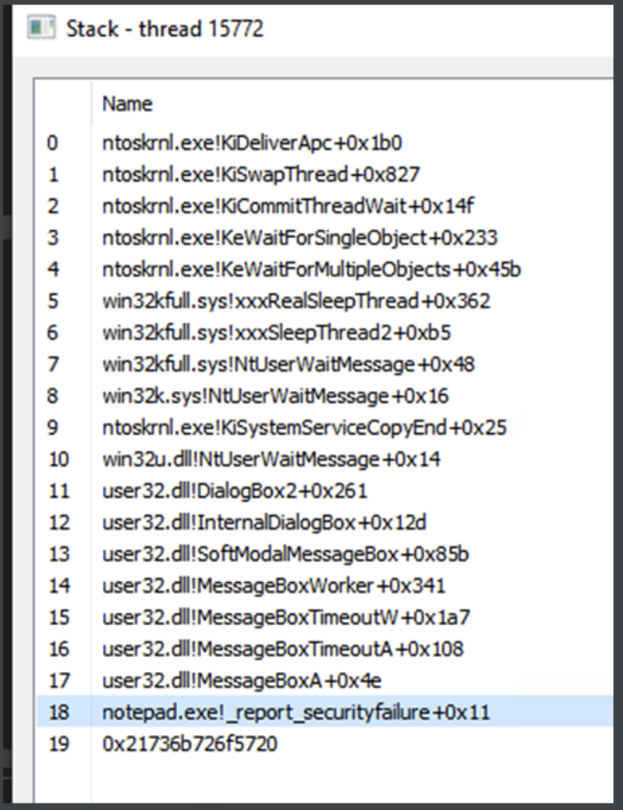 Tracing for such stack events and correlating with System/Application/Security-Mitigations Event Log errors may provide an interesting detection opportunity (Please reach out if you have more information on this!)