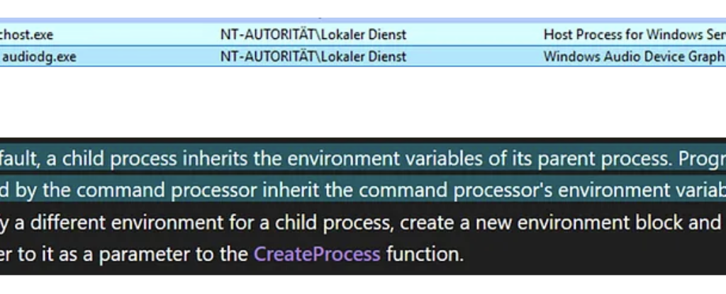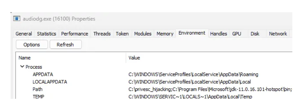 AudioSrv spawns audiodg.exe as a child process using CreateProcess, which causes audiodg.exe to inherit AudioSrv’s security token and complete environment block, including its System paths. Since AudioSrv runs as “NT AUTHORITY\LOCAL SERVICE”, this privilege level is inherited by audiodg.exe.