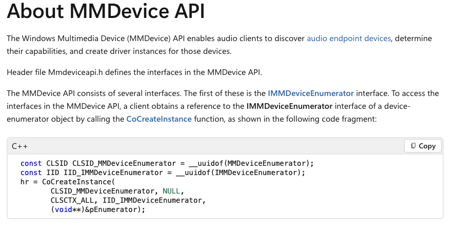 MMDeviceEnumerator: This is the central component of the Windows Core Audio API (WASAPI). The IMMDeviceEnumerator interface provides documented functionality for enumerating audio endpoints, retrieving default devices, and accessing device properties. This is part of the public Windows SDK.