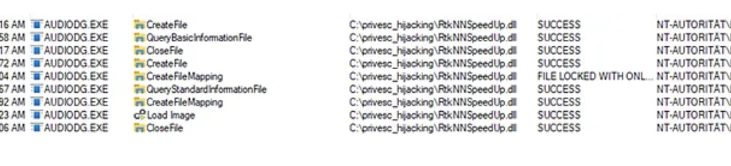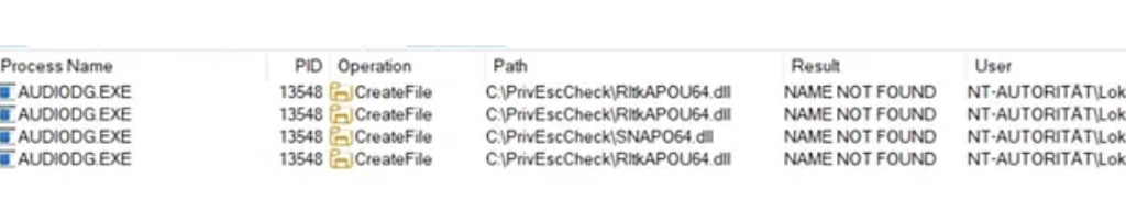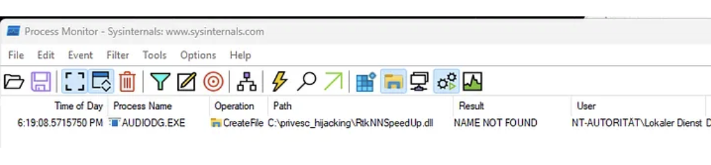 On my hostsystem audiodg.exe tries to load RtkNNSpeedUp.dll from the writable system path C:\privesc_hijacking. The load attempt occurs during runtime of audiodg.exe when APO initialization happens.