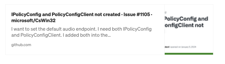 IPolicyConfig: An undocumented interface that Windows uses internally to programmatically set default audio devices, configure per-application audio routing, and manage audio policies. Unlike the read-only MMDevice API, IPolicyConfig provides write access to audio endpoint policy.