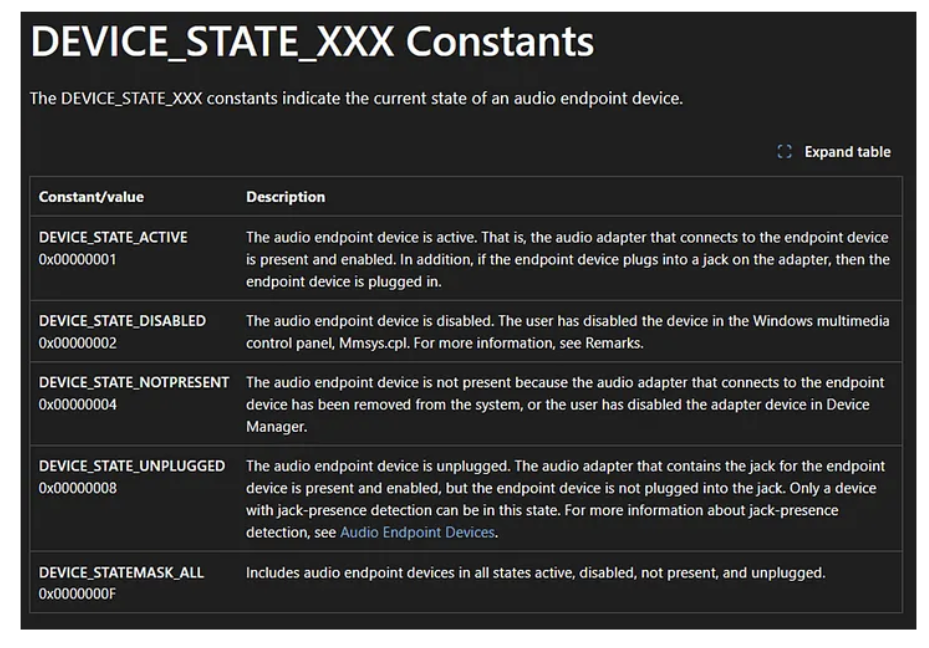Hiding Devices: To hide or disable a device, we first check if it is currently active using the DEVICE_STATE_ACTIVE flag. You should only reactivate devices that were previously active instead of every device to restore the original state, my PoC does this automatically. The device ID to be deactivated is saved to a list for later restoration, then SetEndpointVisibility is called with the visibility parameter set to 0 (disable).