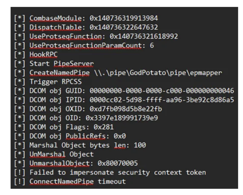 Potato-style exploits therefore fail because the named pipe impersonation step never occurs: the pipe exists, SeImpersonatePrivilege is present, but SYSTEM cannot authenticate to the named pipe which is what we see in the GodPotato output.