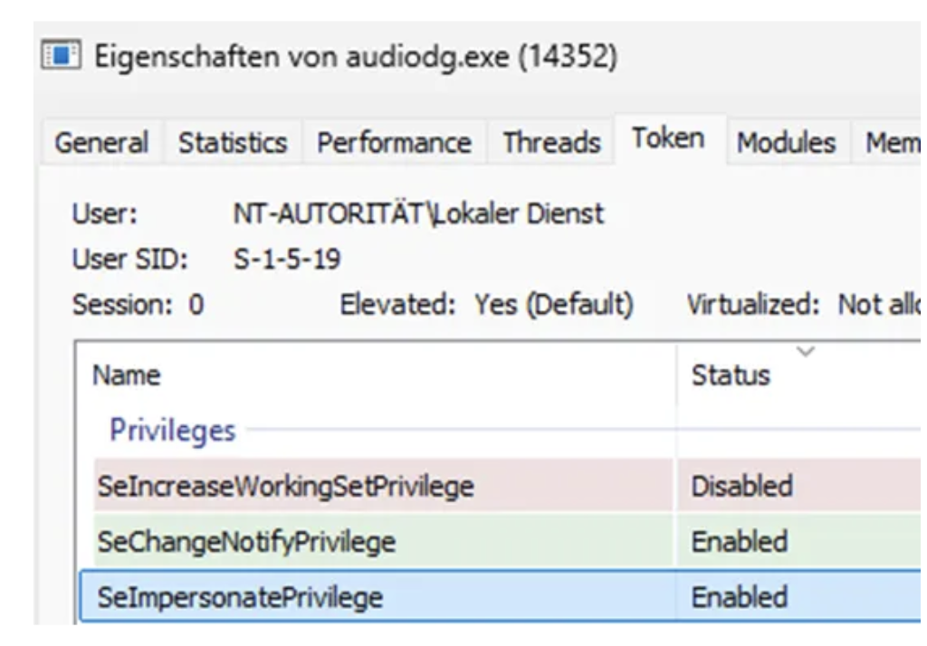As a result, its child process audiodg.exe inherits a filtered LOCAL SERVICE token, even though tools show SeImpersonatePrivilege and SeChangeNotifyPrivilege as enabled.