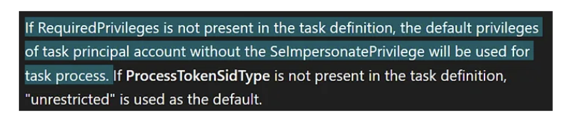 When a scheduled task is executed, Windows does not reuse the restricted service token. Instead, it creates a new process using the default token of the task’s principal account, free from service isolation constraints. However, there is an important caveat documented in Microsoft’s Task Security Hardening: